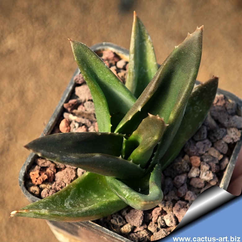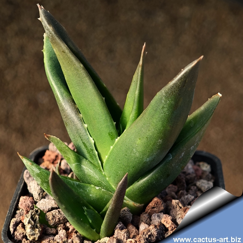 Botanical rarity: a hybrid between Aloe and Haworthia that harmoniously blends traits from both parent genera. Triangular leaves with tiny apical teeth range in color from near-black dark olive to reddish-brown and mahogany. The plant offsets rapidly.