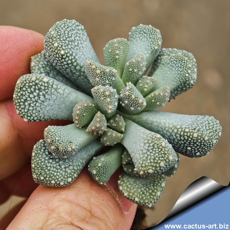 Leaves widen toward a more or less triangular or recurved apex. Thick, light bluish-green, both surfaces finely warty, upper surface with white crust. Margin bears 5–6 evenly spaced pink tubercles.