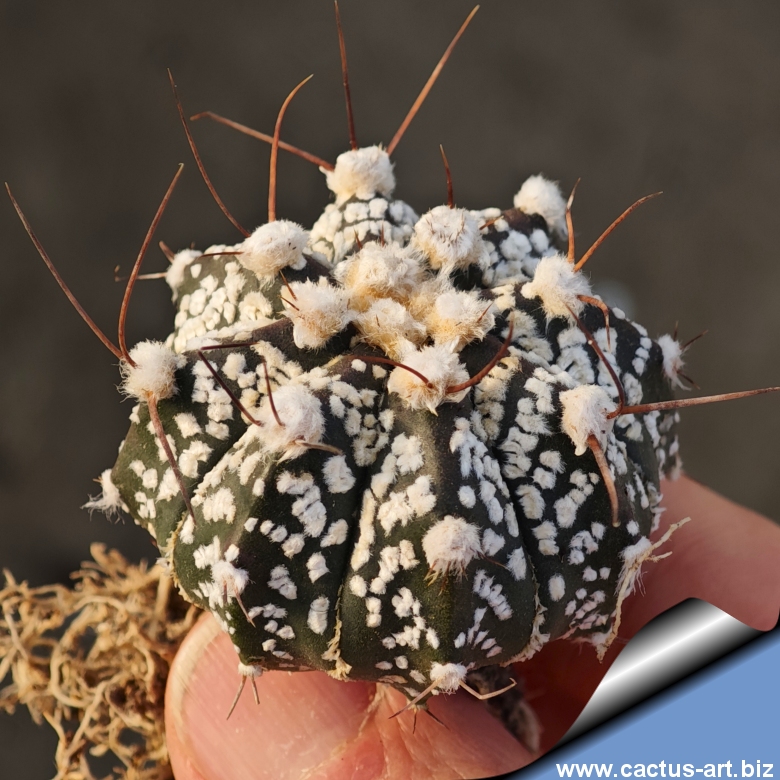 Hybrid A. capricorne x A. asterias 'Superkabuto'. This hybrid inherited large white spots from “Superkabuto”.The ribs are also noticeably raised, clearly indicating kinship with A. capricorne. The flower are also very beautiful.