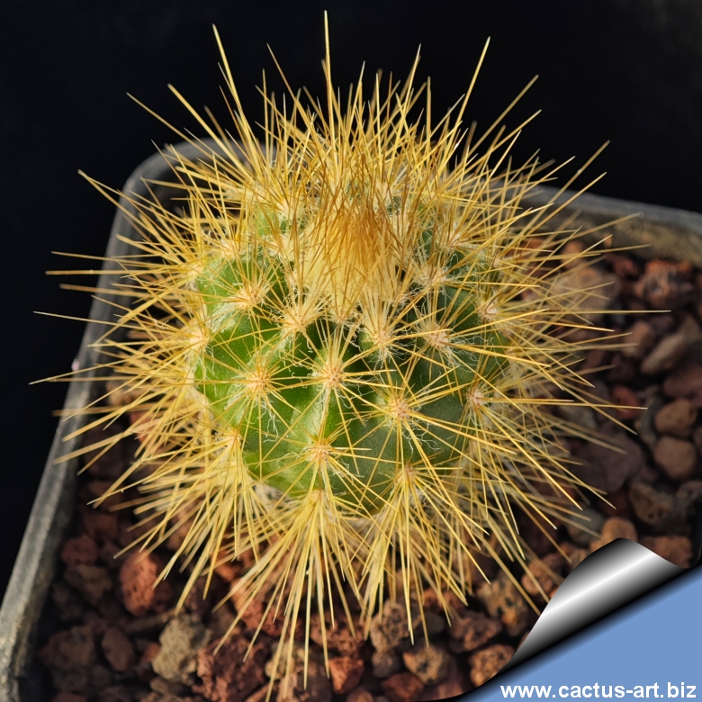 Austrocephalocereus purpureus is a tall growin columnar cactus with golden yellow spines, contrasting on a glaucous-blue epidermis. The flowerus are purple. Impressive and not very common in collections. Its native range is Brazil (Bahia).