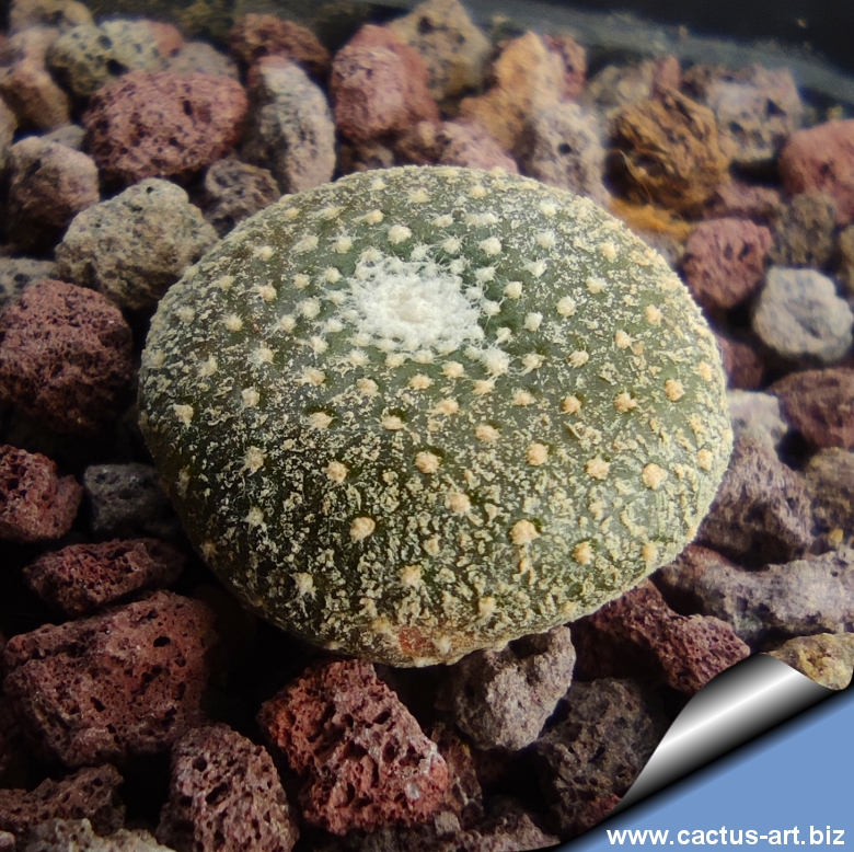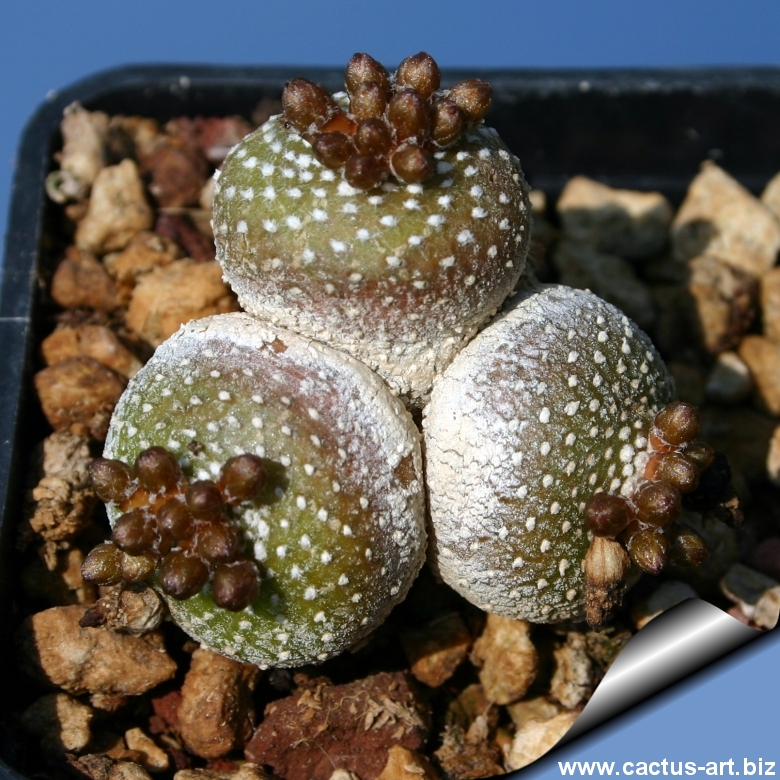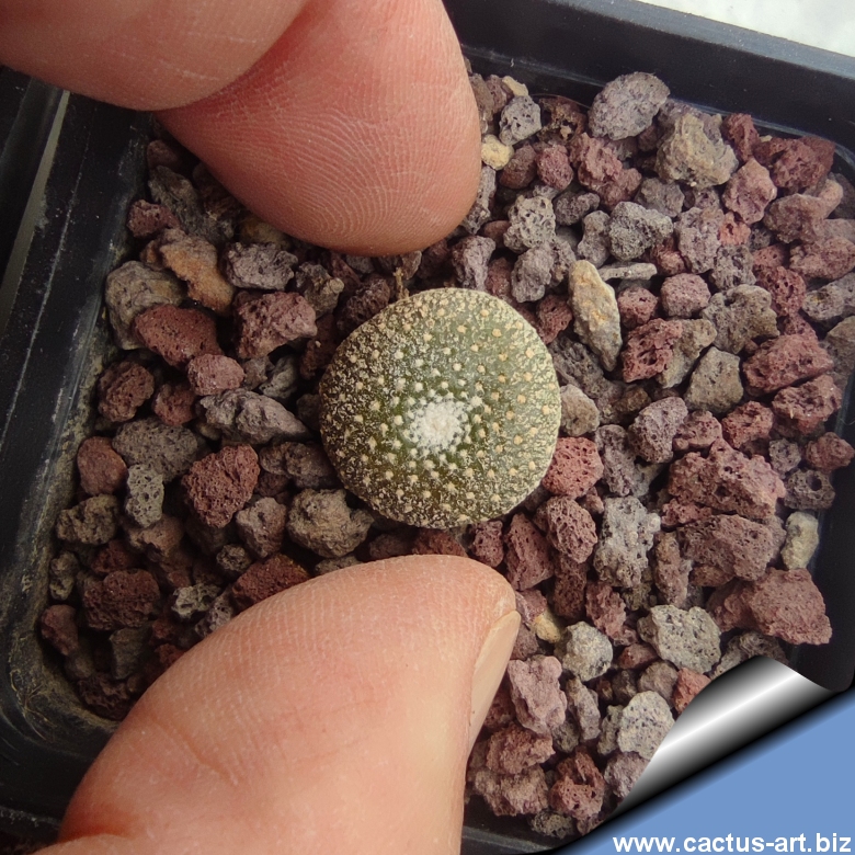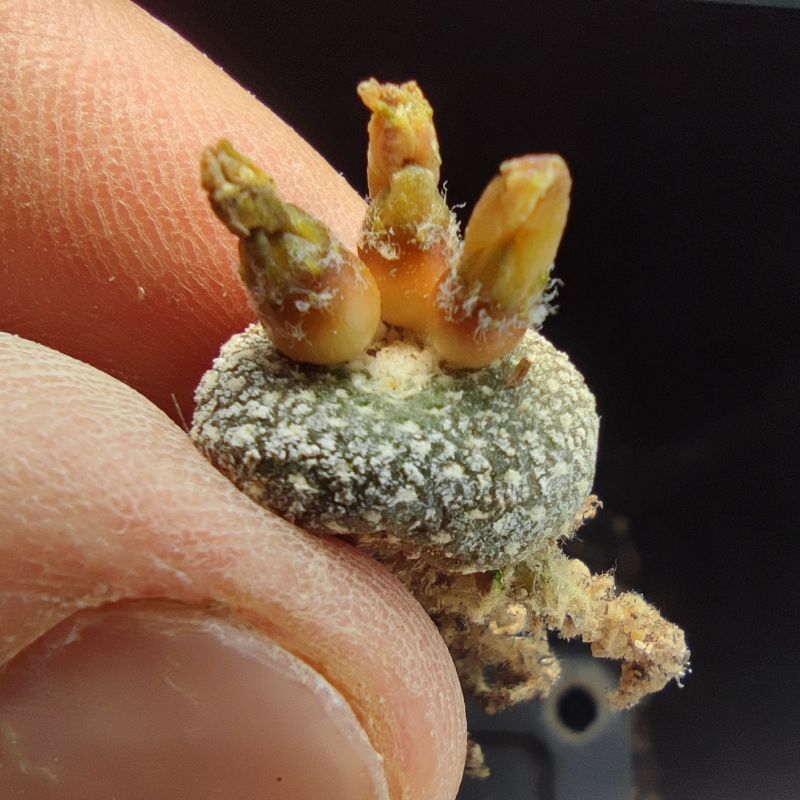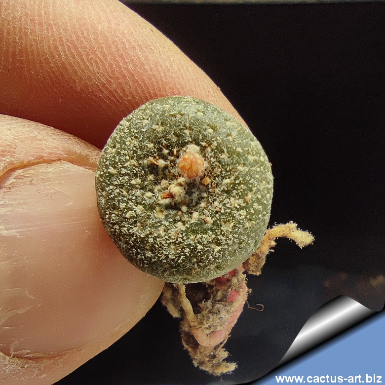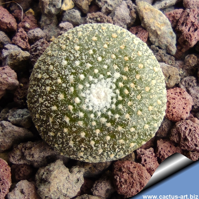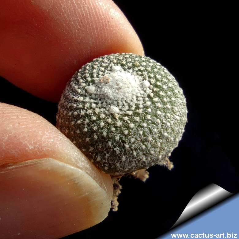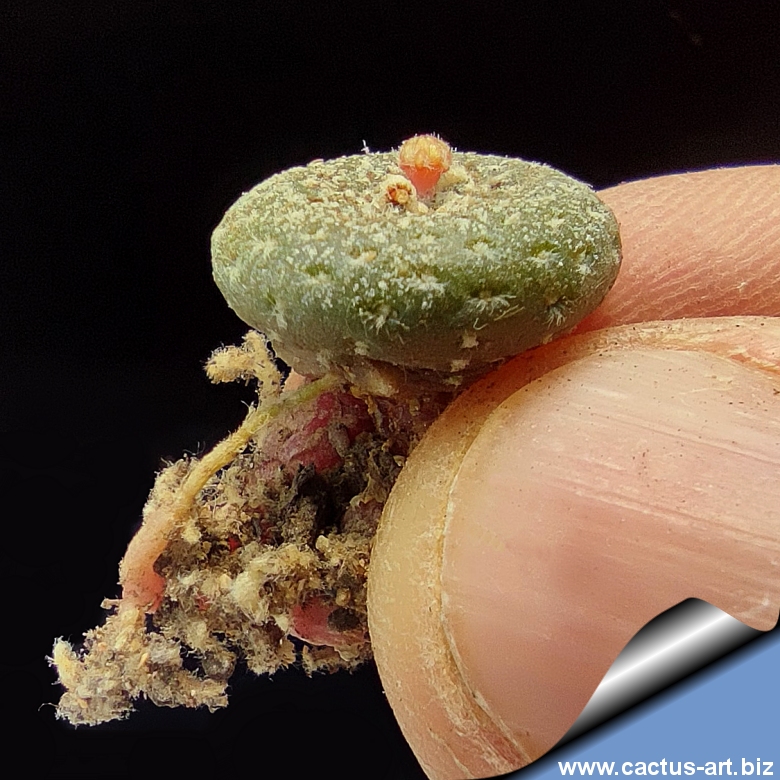 The fechseri is a sturdy variant, with olive-green stems roughly double the size of Blossfeldia liliputana, adorned with white areoles. Its flowers are creamy-white inside and reddish-purple on the exterior. SEEDLING 1,2-1,5 cm Ø.