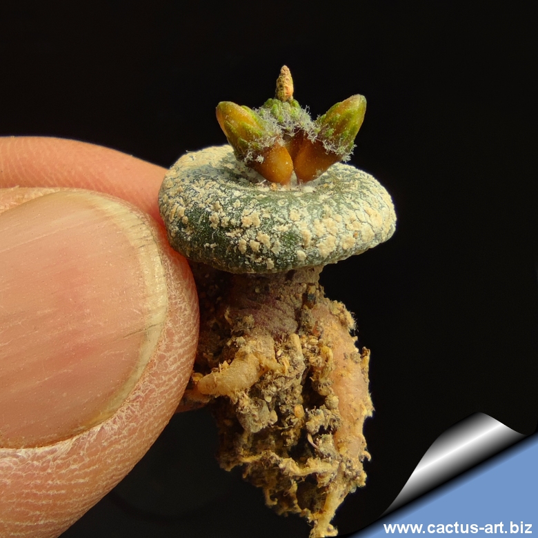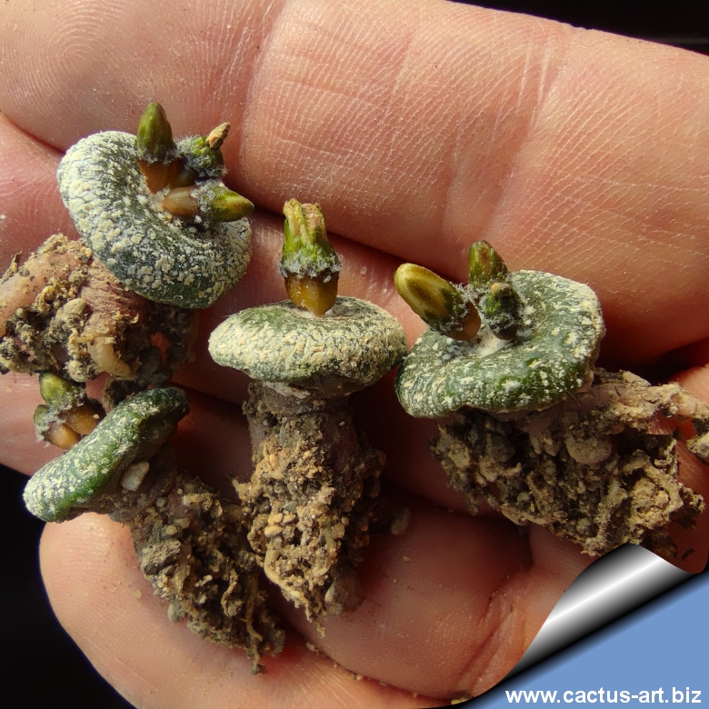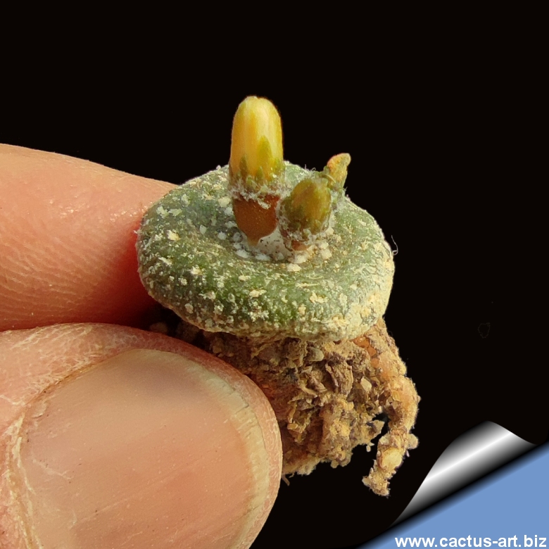 Blossfeldia mizqueana is among the smallest cacti in the world, featuring a flattened, coin-like body. It originates from rocky fissures at high elevations in Bolivia’s Mizque Province. 1,2-1,6 mm. OWN ROOTS. Seed grown, flowering size. VERY RARE!!!