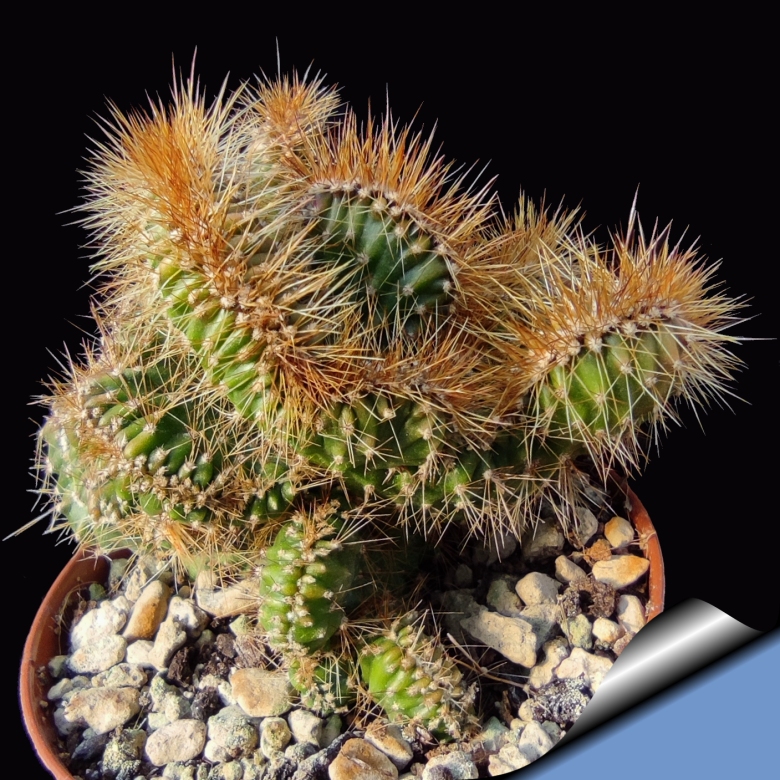 Cereus columbianus f. cristata (a.k.a. Pilosocereus lanuginosus ssp. colombianus f. cristata) is appreciated by lovers of succulents for its crested fan shape. The green stem is covered with small white areoles and thin yellowish needle-like spines.