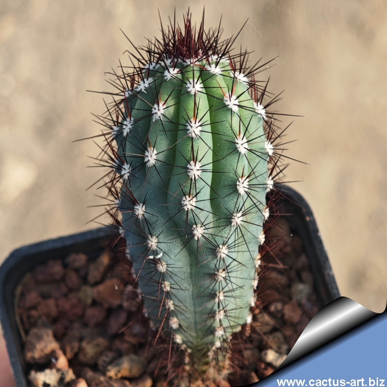 This stunning columnar specimen commands attention with its unique green-blue stem contrasted by straight brownish-black spines. The short-but-sharp spines create perfect geometric patterns against the smooth stem.