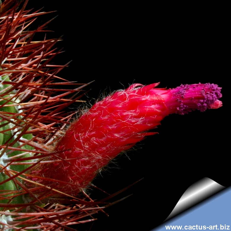 It's specific name comes from old Greek and means "red spine" for the colour of its clusters of spines. It's a barrel type of cactus and stay globular during a long period before becoming shortly column-shaped. Family: Cactaceae (Cactus Family) Scientific name: Denmoza rhodacantha, (Salm-Dyck) Britton & Rose 1922 Origin: Widespread throughout the mountains of Argentina (Mendoza to Salta) at 2000- 2800 m of elevation. Conservation status: Listed in CITES appendix 2. Etymology: The name of the genus is an anagram of the north-western province of Mendoza. Taxonomy: The genus Denmoza comprises only one species allied to Cleistocactus, but it has also been referred to Echinopsis, Cereus, Echinocactus and Pilocereus. The plants described as Pilocereus erythrocephalus and later transferred to Denmoza has sometimes, for instance by Backeberg, been considered as another species of the genus. D. rhodacantha changes considerably in the habit with age. The description of D. rhodacantha refers to young plants having strong spines in areoles. Old plants of the same species with multiple number of spines and sometimes with thin, 6 cm long bristly spines correspond to the description of D. erythrosepala.