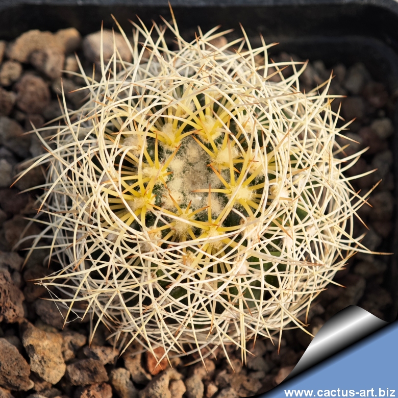 It has flexible interlacing spines up to 1-2 cm long, that are pectinate, flexible, creamy white or whitish-yellow with dark tips, recurved backwards, sitting on the plant like spiders.