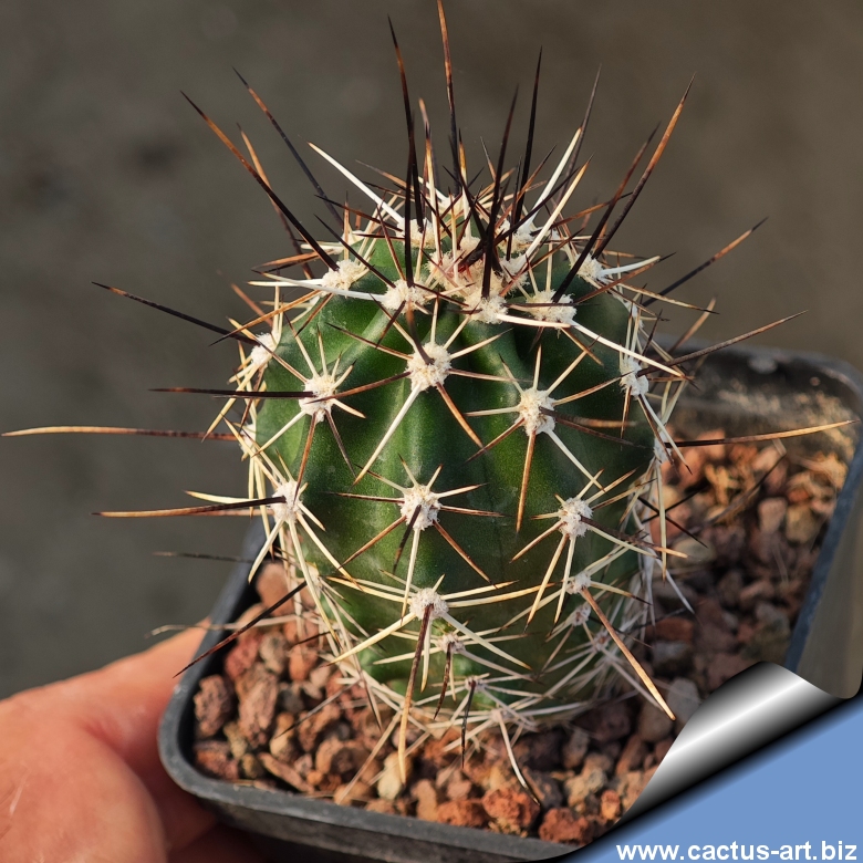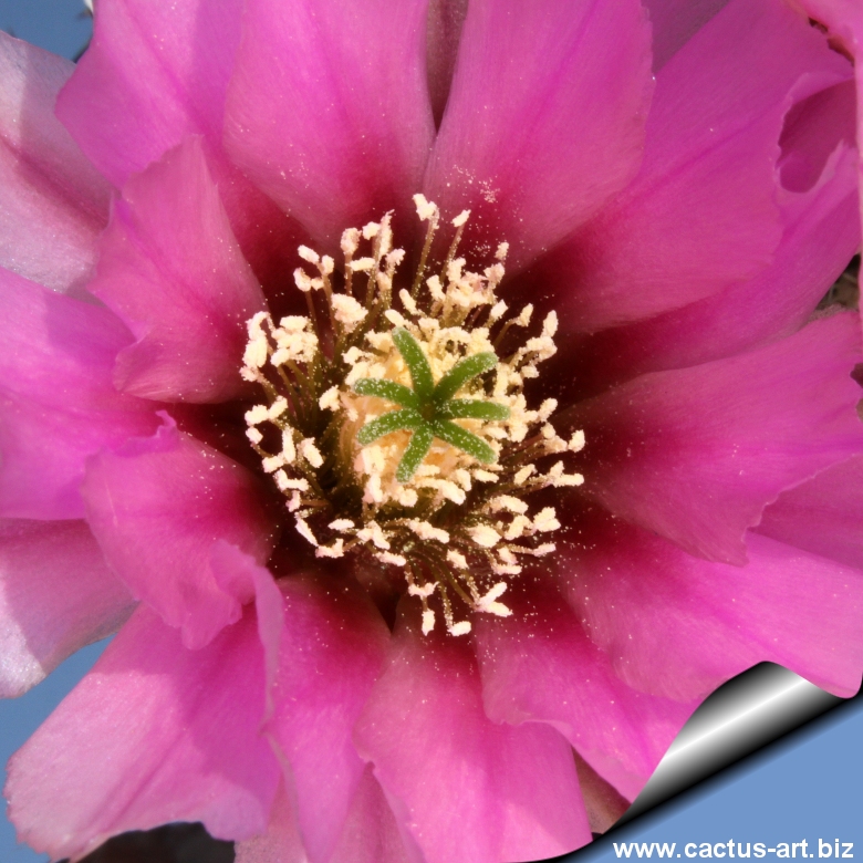 Long, strong central spines. Large pinkish to mauve flowers with a darker center that strikingly contrasts against creamy anthers and a green pistil.