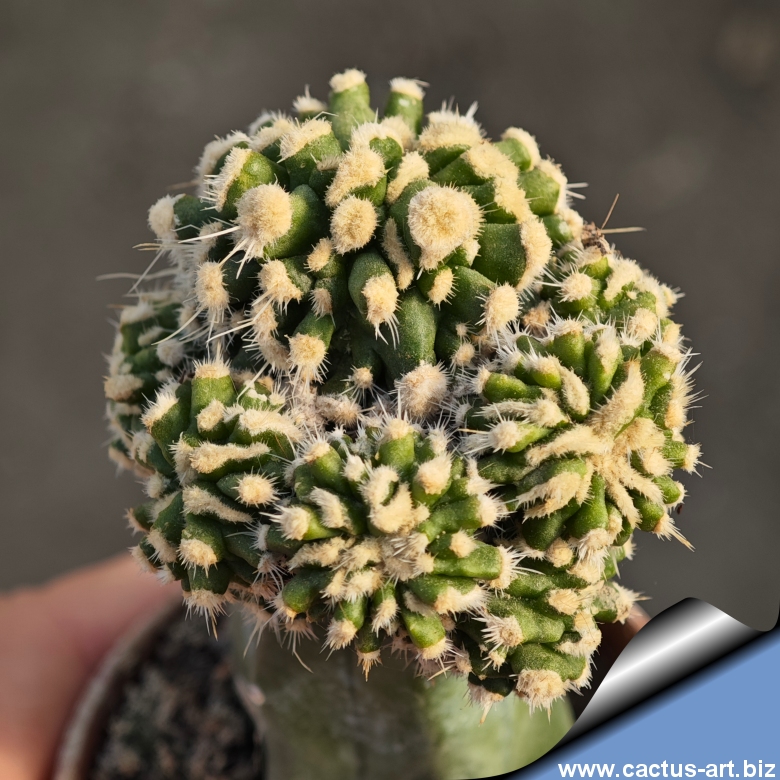 The extremely elongated areoles, bearing short, pure white spines, give this plant a truly distinctive appearance, making it instantly recognizable. Its unique and characteristic structure makes it a rare cactus, prized for its unusual look and high ornamental value.