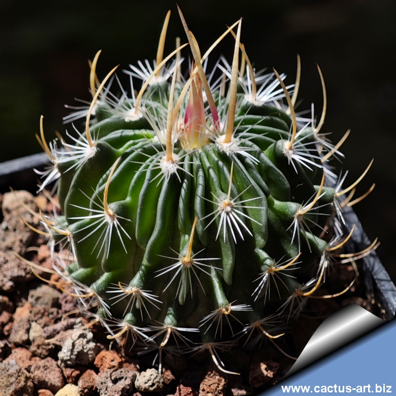 Compact globular cacti featuring slender, wavy ribs, elegant papery central spines, and strikingly striped blooms.