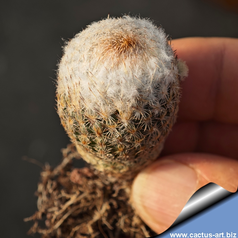 Tiny, clump-forming species. Elongated, slender stems (1–3 cm in diameter) with beige spines; the longest emerge from a dense woolly apex and have rust-colored tips.