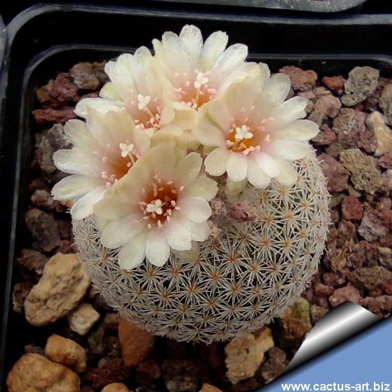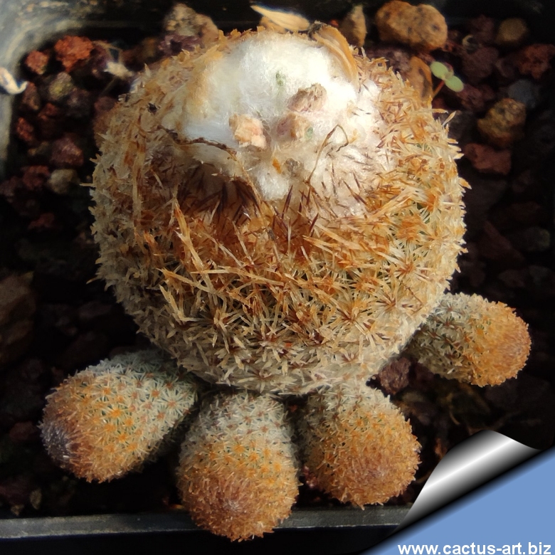 This is a petite cactus, which branches and becomes somewhat elongated when old. The short spines are appressed to its body, reddish-gray or brownish in the crown of adult plants. Small creamy pink flowers sprout from the wool at the apex.