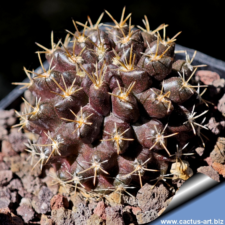 A small, flattened spherical species with a dark bronze-colored epidermis. As it matures, it produces beautiful spines and flowers. Also known as Pyrrhocactus carrizalensis.
