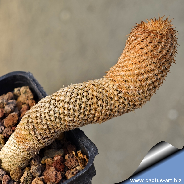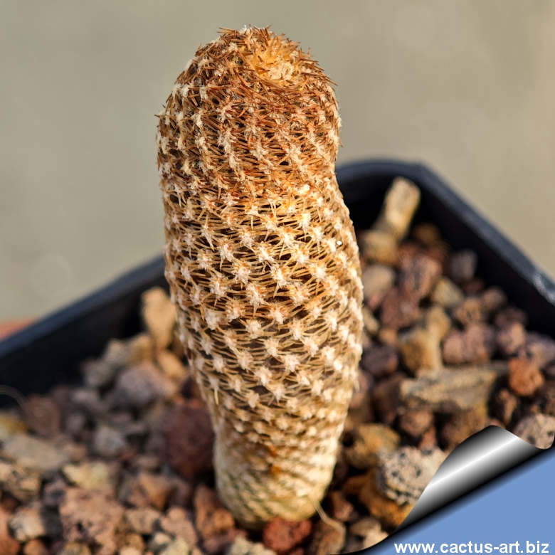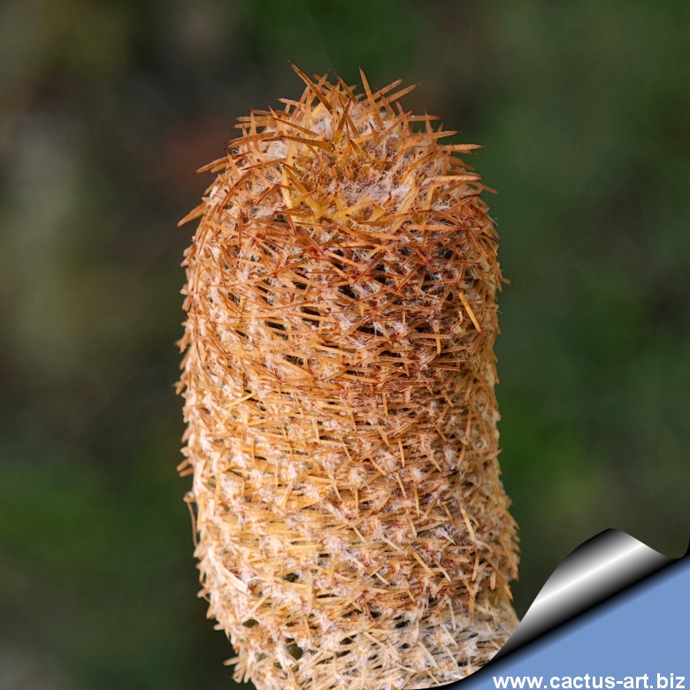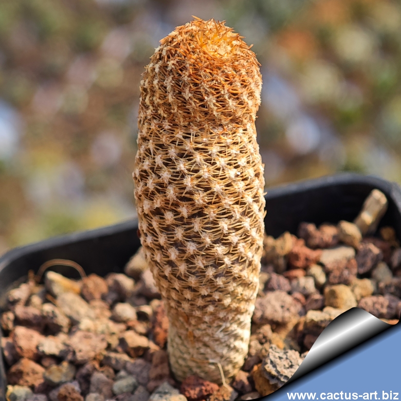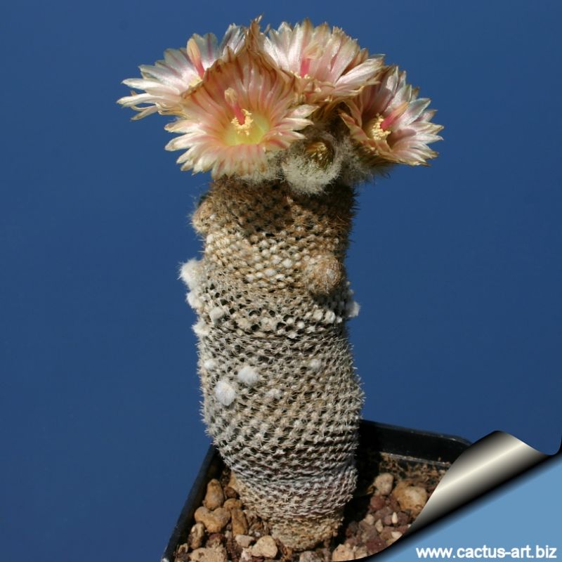 A beautiful small-growing species with slender, finger-like stems covered in very short, appressed spines in ochre to amber tones, nestled among dense creamy wool. Large creamy-pink flowers display a distinctive silky sheen—a truly unusual hue.