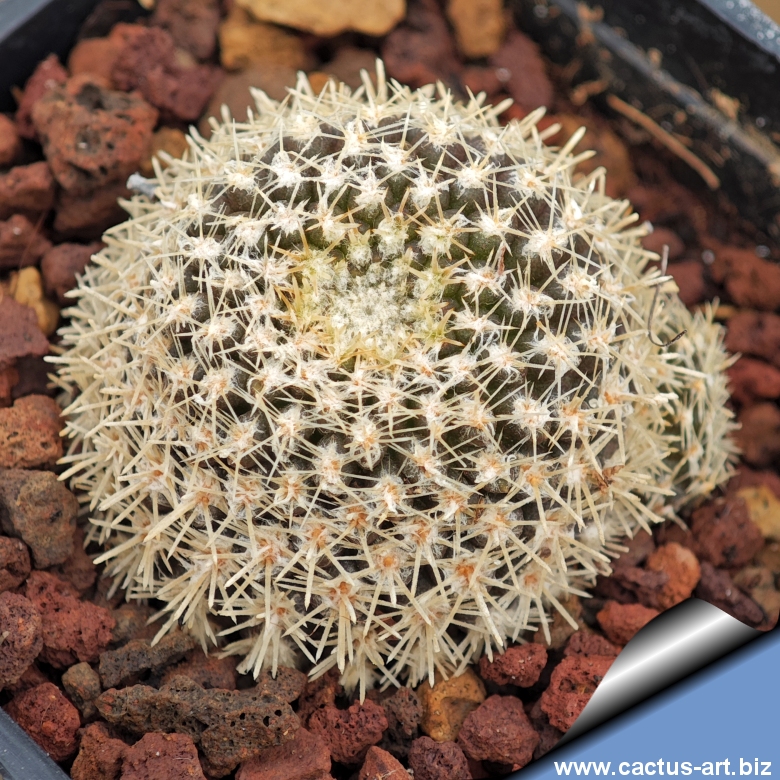 A tiny geophytic cactus with stems barely emerging above ground. It has a swollen, carrot-like taproot ending in a top-shaped body, clustering in age. Spines are thin (2–4 mm), pectinate, curved inward, and dull whitish to yellowish.