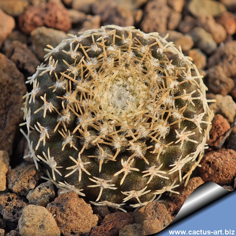 Tiny flattened body, short spines, dark brown epidermis, and yellowish flowers. A very pretty and unique plant.