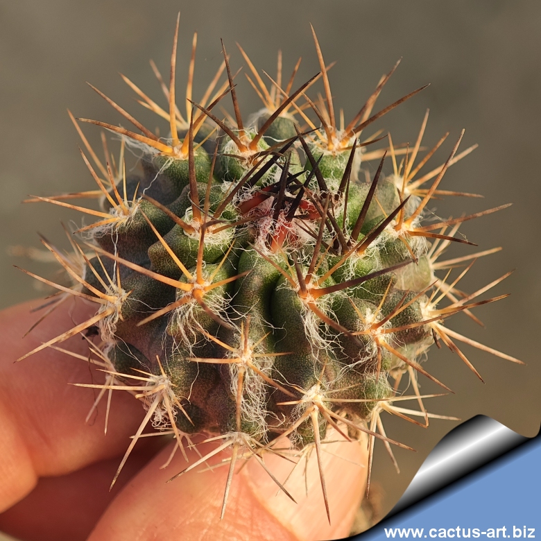Spiny dark olive-green to purple body with white woolly depressed apex. Areoles bear flakes of silky white hairs. Pinkish flowers. Potted in round (5.5 cm Ø) or square (6×6 cm) containers.