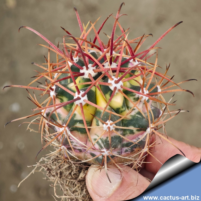 Ferocactus acanthodes featuring red spines and yellow, white, or pink variegation on the body. Each plant is distinct, with unique patterns and colors. Rare and captivating specimens.