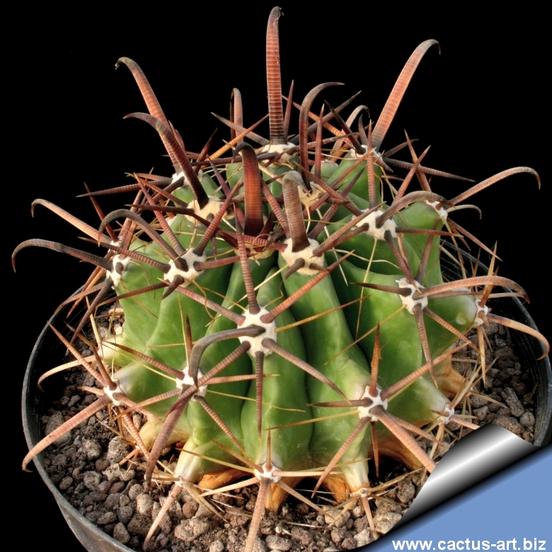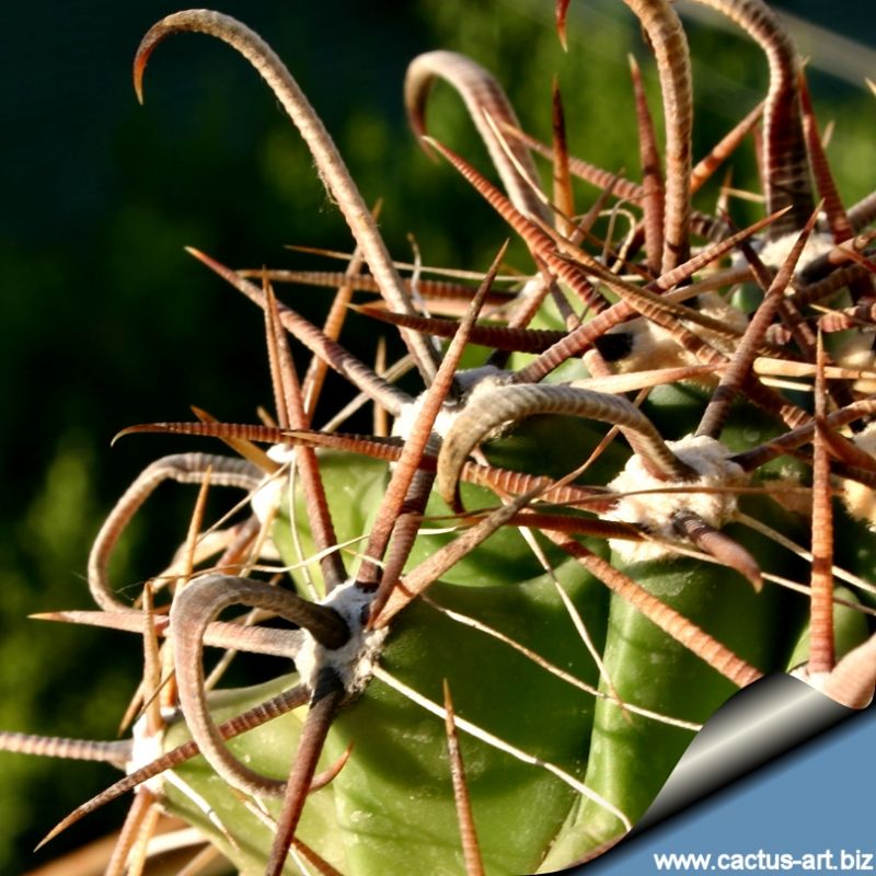 A large barrel cactus, taller than wide, reaching about 50 cm in height and 30 cm in diameter, with a slightly glaucous stem. Central spines are strong and hooked, starting red and turning light brown to grey with age.