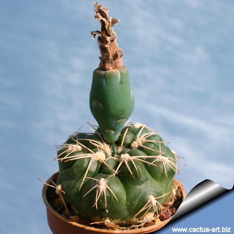 | Description: It is a weak spined small species notable for the comparatively large flowers that branches forming numerose offsets. This plant is part of a very confused group comprising G. siegelianum and G. sutterianum. Stem: Dull blue-green, very flattened to globular, up to 9 cm tall and in diameter. Root: Large tuberose root apparatus. Ribs: Up to 13 with low, rounded, chin-like tubercles.. Areoles: Oval with white wool. Spines: 5 up to 12 mm long yellowish or whitish, weak, long, stinging. Flower: Large wide delicate pink-white, up to 7 cm tall, 6 cm in diameter. Fruit: Club-shaped, light blue when ripe. NOTE: This species is closely related to Gymnocalycium sigelianum (which has paler flowers and some differences in the number and the colour of spines) | |