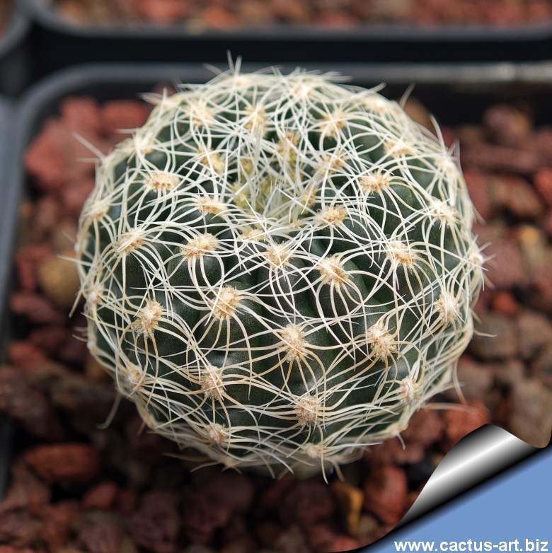 Slow-growing globose cactus with slightly flattened top and soft white spider-like spines. Stunning pink-magenta flowers (6 cm wide) crown the apex in late spring/early summer.