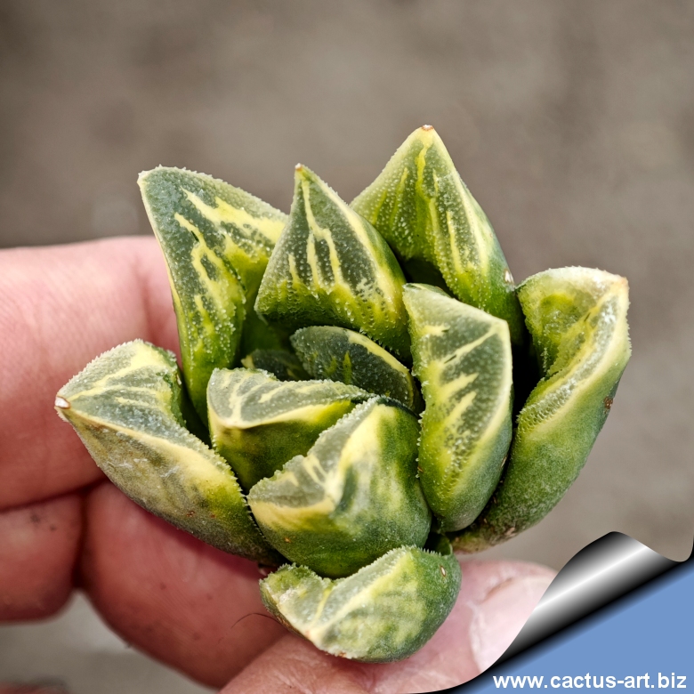A stunning variegated Haworthia, blending dark green, lemon yellow, and hints of orange. Its slow growth is worth the wait for such a mesmerizing display. Highly coveted rarity!