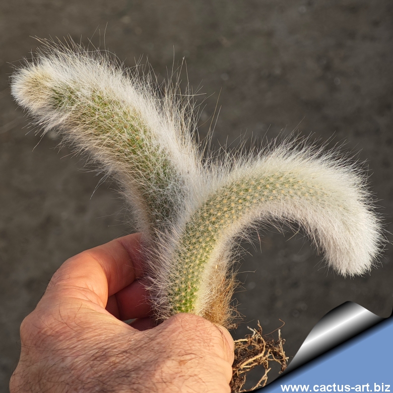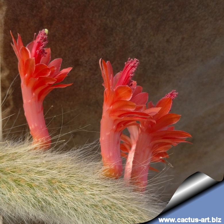A truly unique and unmistakable cactus with a gracefully trailing habit. Long, dense, hair-thin white bristles cover its pendulous stems. The flowers are stunning—zygomorphic and orange, with a central crown of very short white inner petals from which long red stamens, violet anthers, and a brilliant green stigma dramatically emerge.