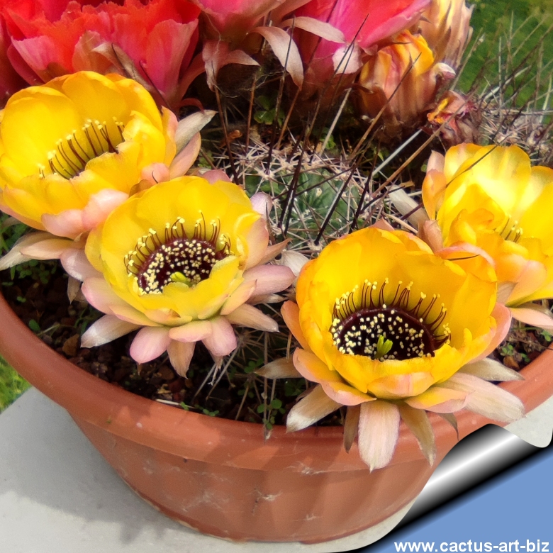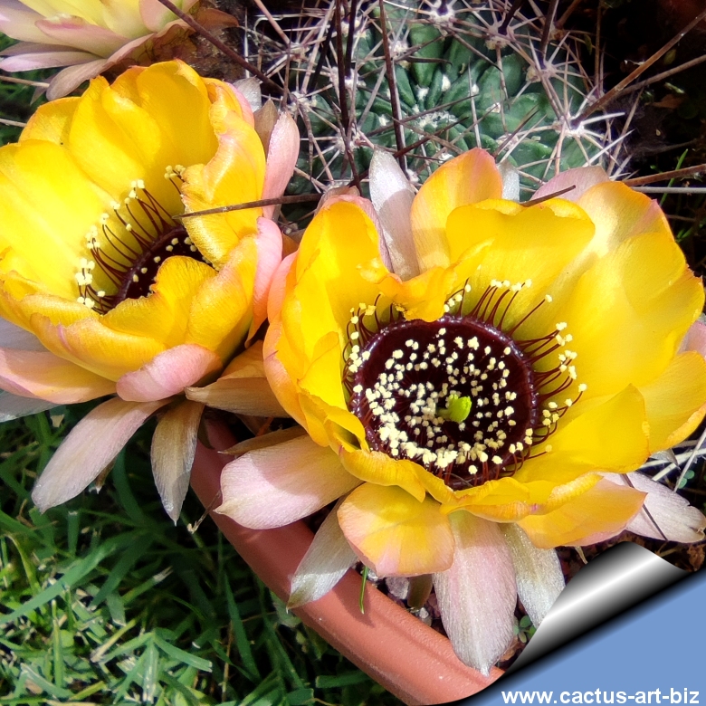 Lobivia jajoiana is a very popular small cactus priced for its multicoloured flowers. This is the yellow flowering form. The hymen (or throat ring of the flower) is always of a very dark purple-violet to black.