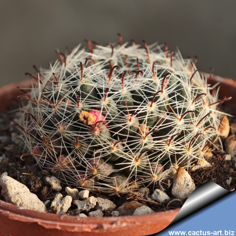 A charming dwarf Mammillaria with short, curved, hairy central spines that range from brown to yellow-orange when young and gradually fading to gray as the plant matures..