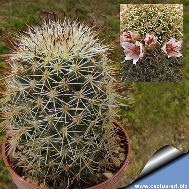 Mammillaria cerralboa is a cylindrical cactus with many yellow-brown spines, white areoles, pretty pink flowers with dark pink stigma lobes.