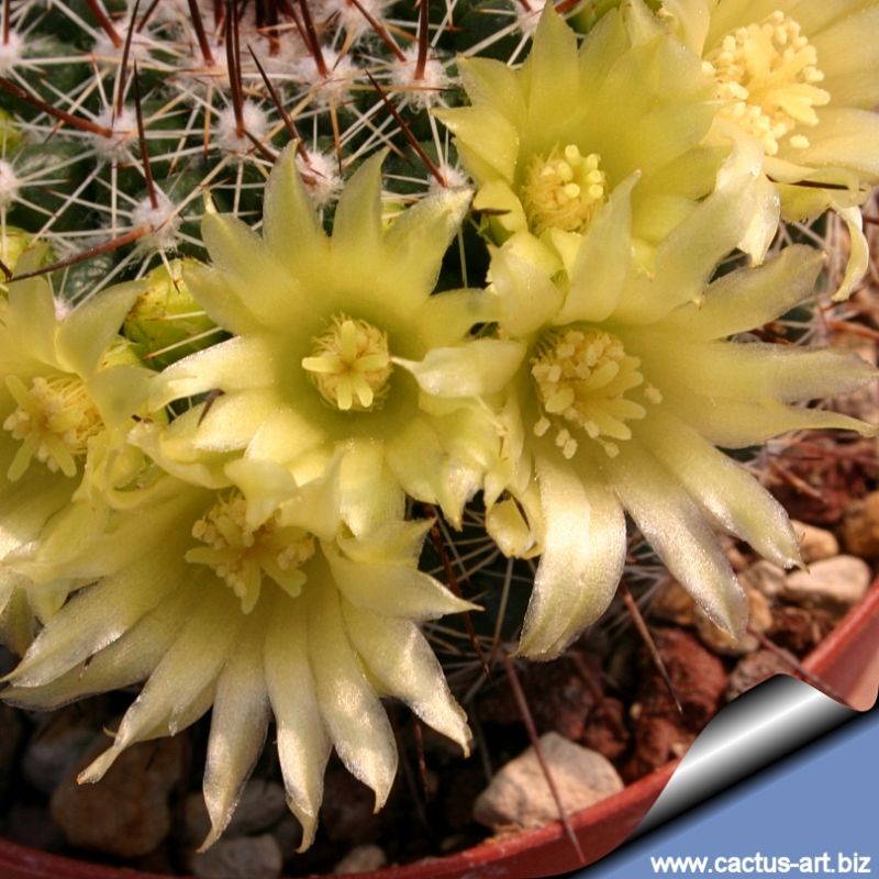 After several years form very large clumps up to 1 m wide (space permitting!). Central spines straight, golden brown, reddish to almost black, sometimes absent. Flowers greenish-yellow.