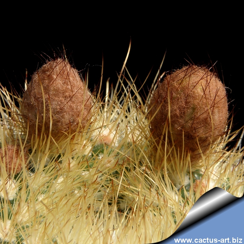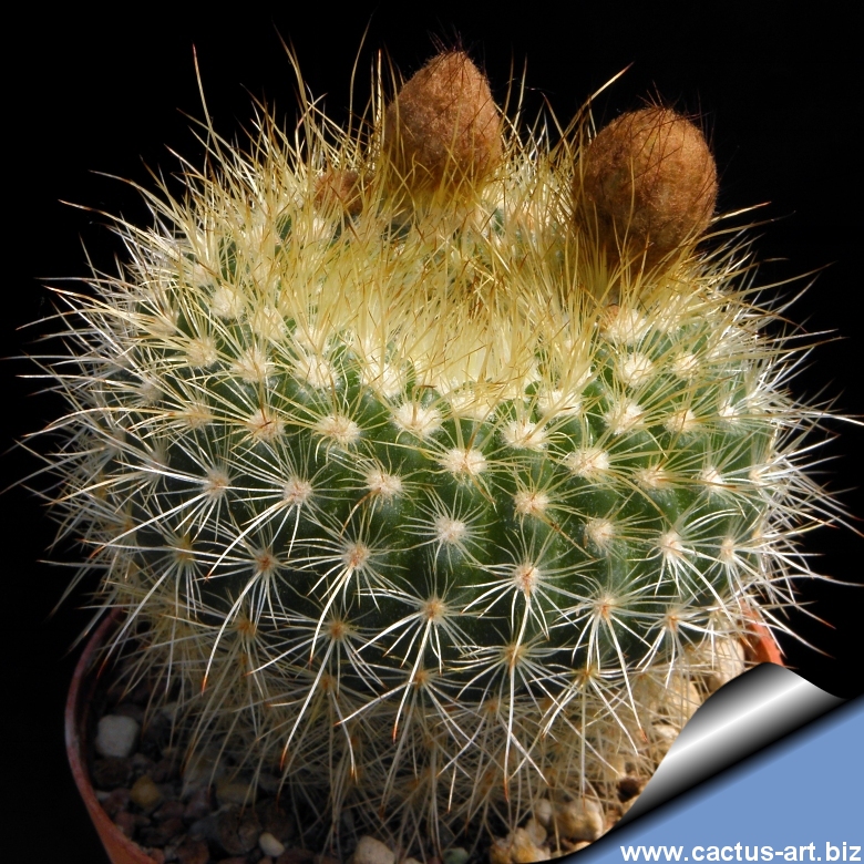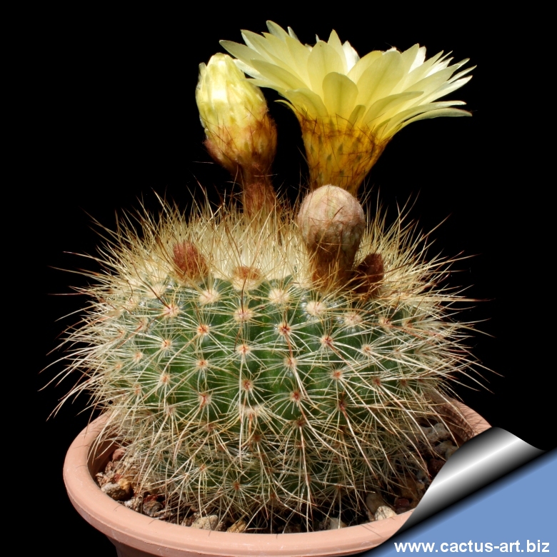 Flattened spherical body with numerous ribs, producing up to seven golden-yellow flowers at once in late spring to early summer. Spines are thin, hair-like, sometimes curved, pale yellow-white and only slightly differentiated.