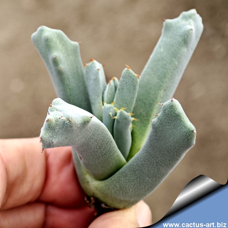 Fine, wispy teeth at the tips of long, thick succulent leaves, grey-green in color and rough to the touch, reaching a maximum height of 5 cm.