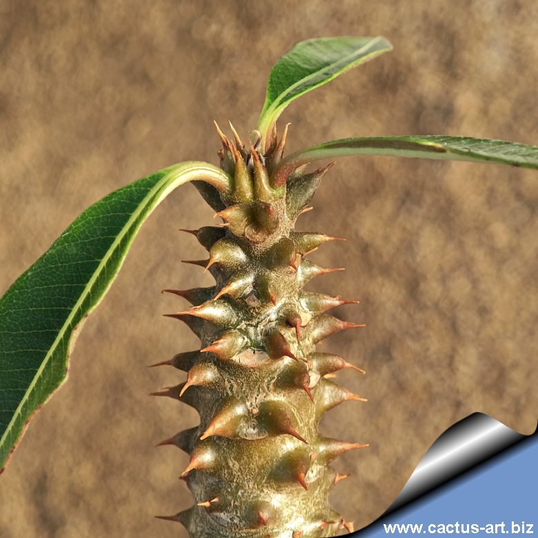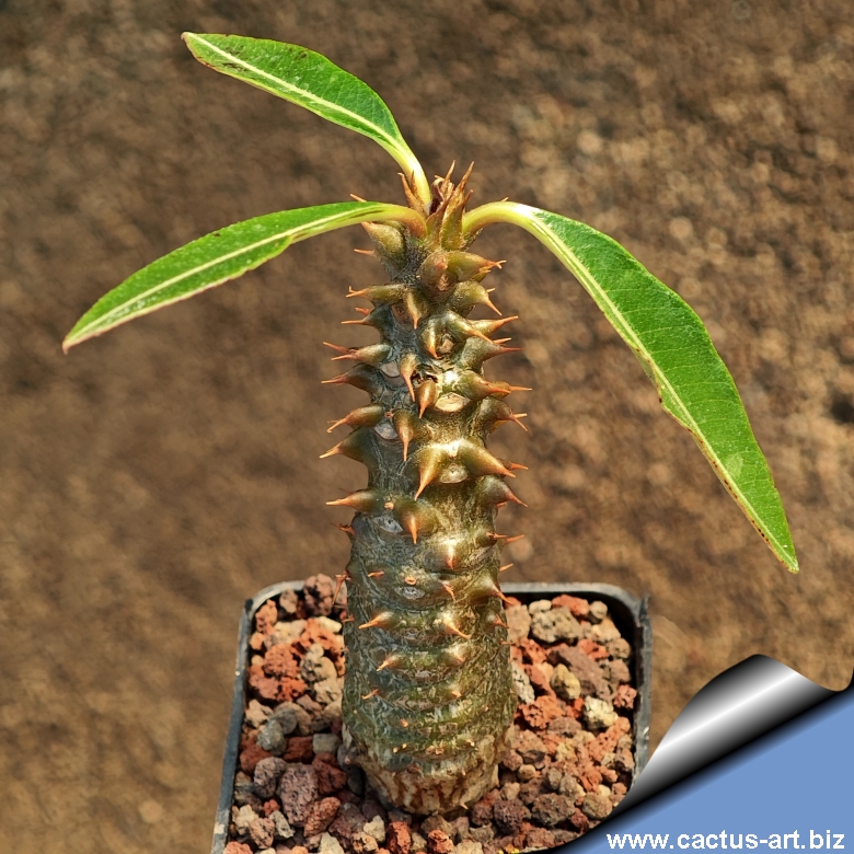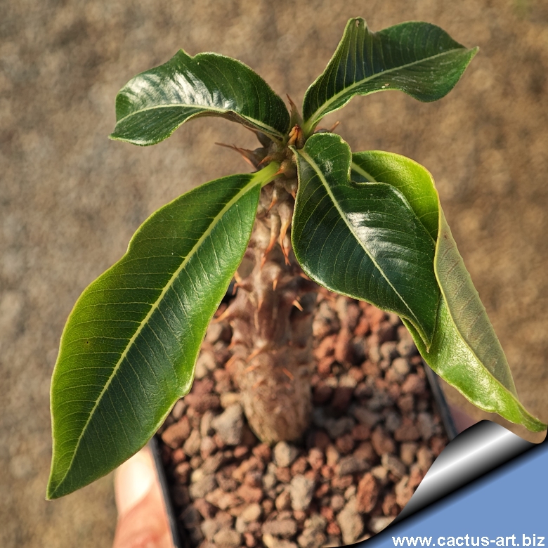 Pachypodium baronii is a compact succulent shrub with a thick, bottle-shaped caudex native to northern Madagascar (300–1200 m). Known for its striking red flowers with a contrasting white center, creating a bold and dramatic display.