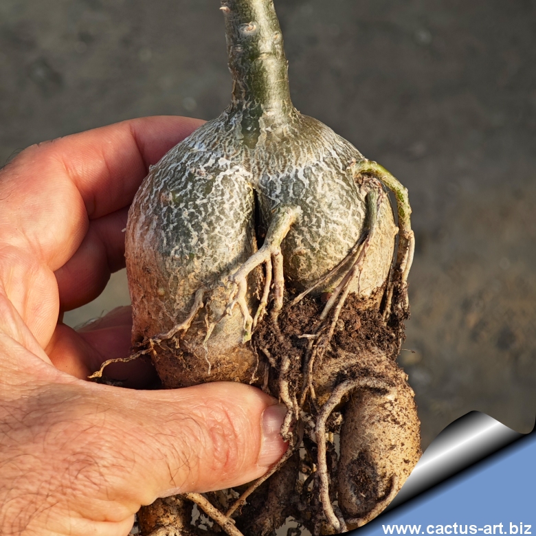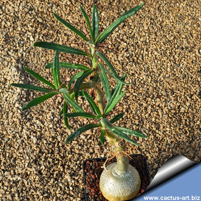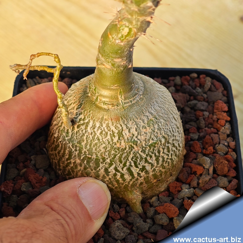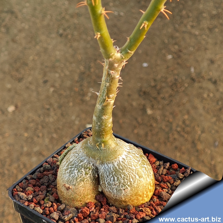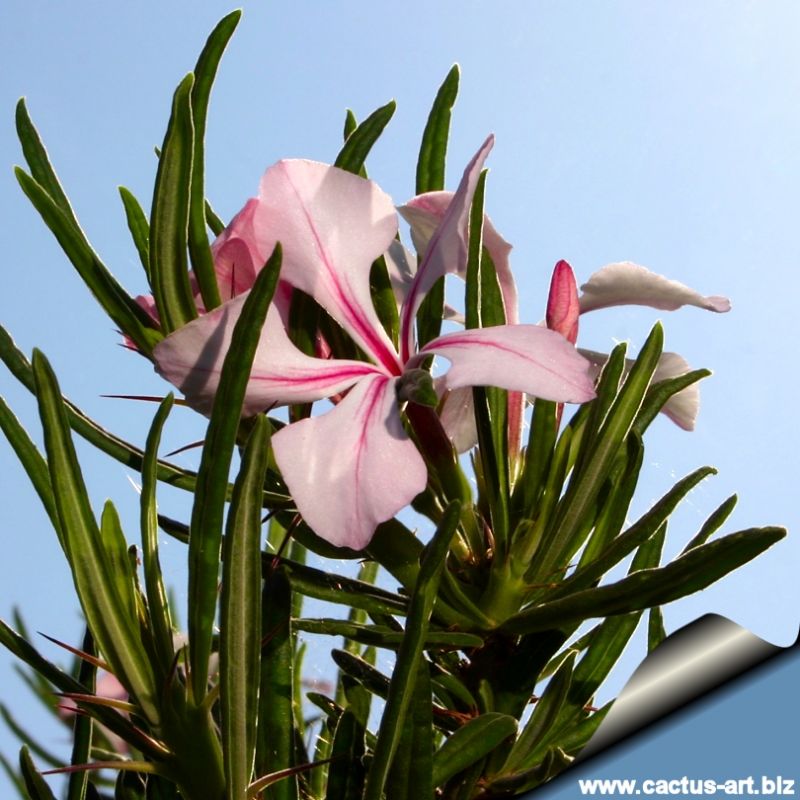 A slow-growing caudiciform with a partially buried tuberous base producing slender branches. Small spines occur in pairs beneath the leaves. Flowers are crimson, pink, or white, each enhanced by a dark central stripe.