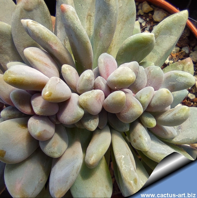 Pachyveria is a hybrid between "Echeveria rosea" and "Pachyphytum bracteosum". It has bluish-green pointed leaves, covered with a whitish bloom. In full sun it takes on a beautiful purple-green hue.