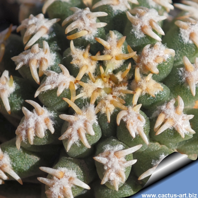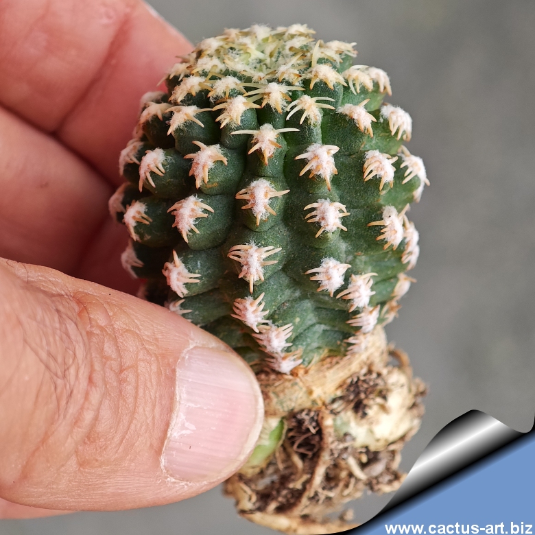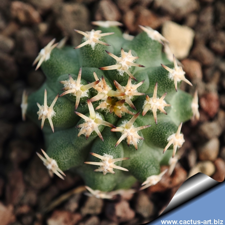 Pygmaeocereus bieblii is a fascinating little, geophytic cactus with short thick spines. It usually grows solitary but occasionally forms small clusters or even large mats flat to the ground. It is really a particular cactus with very peculiar spines.