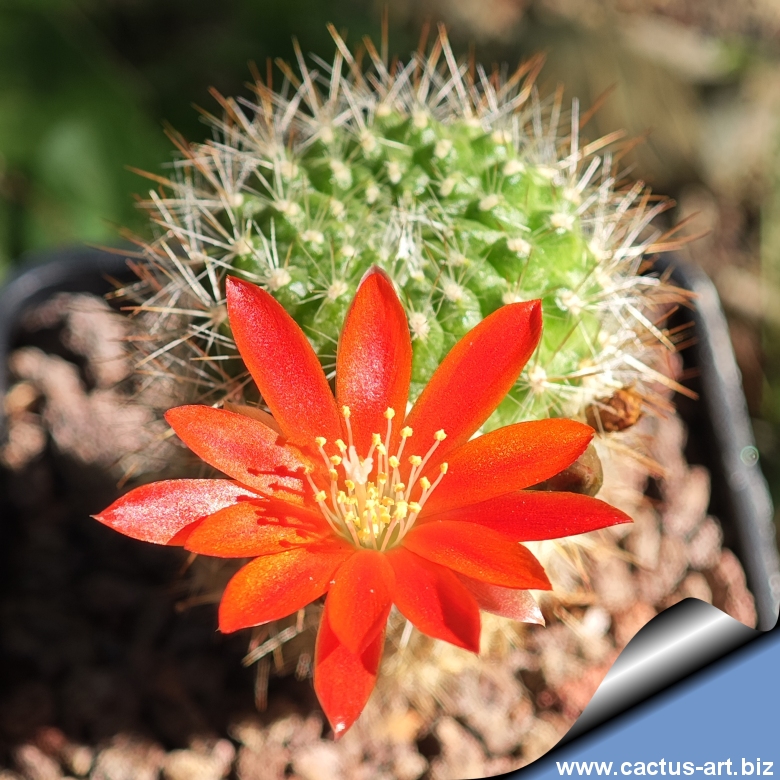 Soft, white, silky spines and closely packed light green tubercles. It blooms generously with striking vermilion flowers that contrast vividly against the pale body.