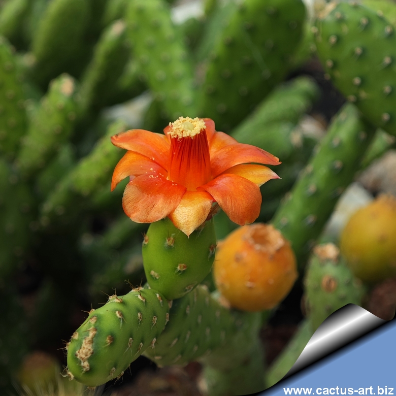 Lovely plant with small segments that resemble those of a miniature Opuntia, but cylindrical and without glochids! It has only a few occasional short bristle-like spines and produces a profusion of rich orange flowers in profusion.