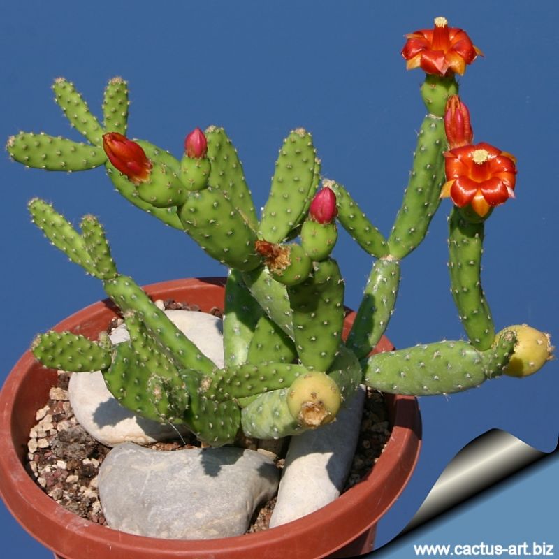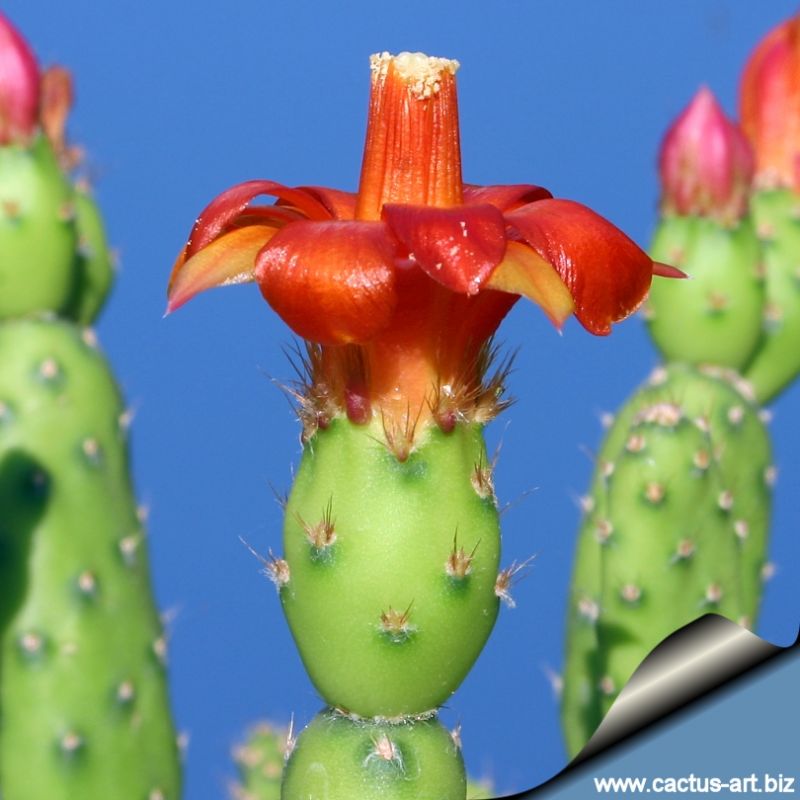 Lovely plant with small segments that resemble those of a miniature Opuntia, but cylindrical and without glochids! It has only a few occasional  short bristle-like spines and produces a profusion of rich orange flowers in profusion.