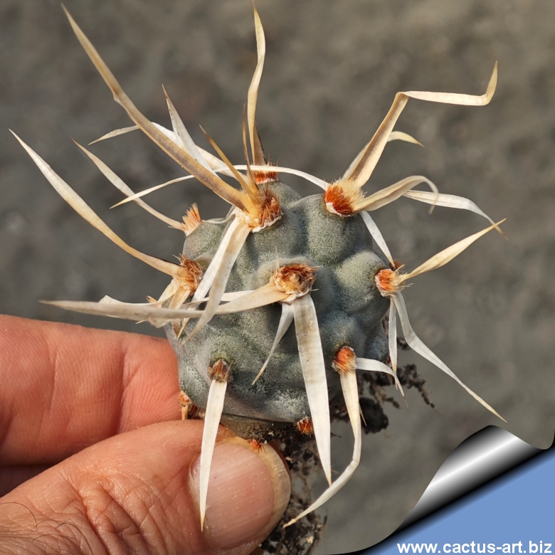 Ash-grey globular segments with broad areoles covered in orange bristles. The long, translucent-white spines flatten into papery blades, resembling frozen lace. Nature's perfect marriage of fiery bristles and icy-looking armament..