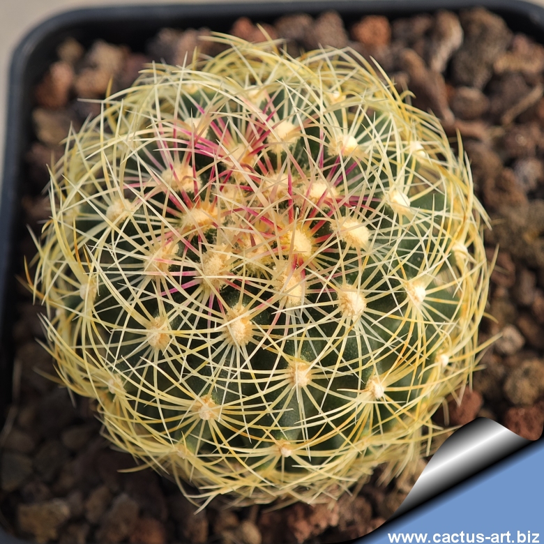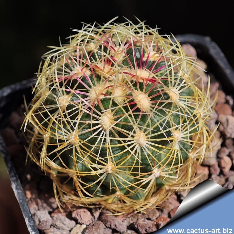 A compact subspecies with smaller and thinner straw-coloured (occasionally red) spines that form a dense covering around the plant. The flowers are strikingly bicoloured: magenta petals with a vivid red throat.