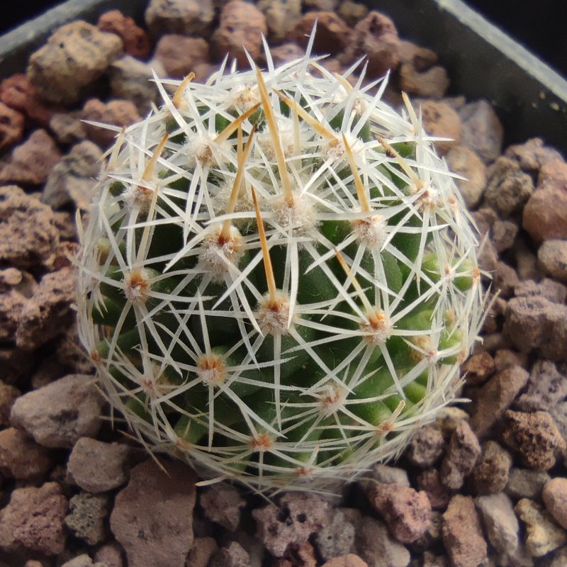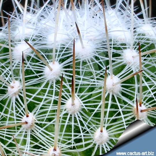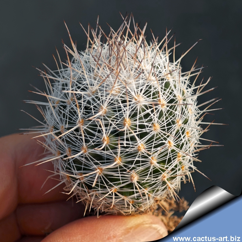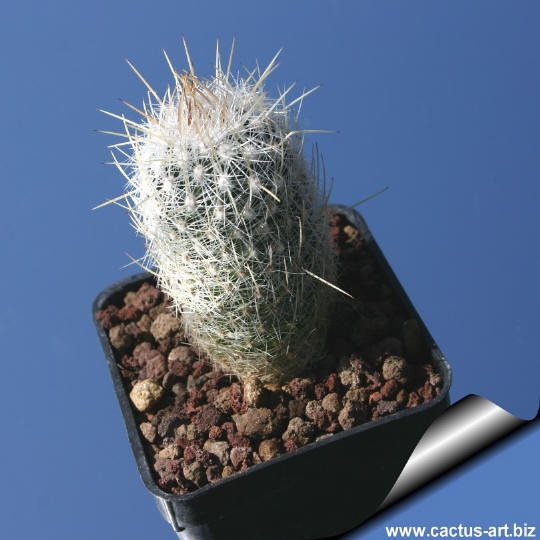 Solitary or slowly basally branching, with globose or cylindrical stem; tubercles mostly hidden by spines. Areoles woolly white; central spines creamy-white, with about 20 glassy silvery grey-white radial spines. Flowers deep pink or pink-purple.