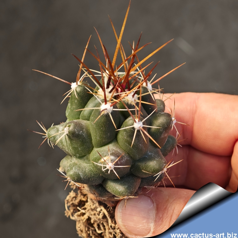 Globular cactus with prominent tubercles and showy yellow blooms. Its straight vertical central spines (2-7 cm long) range from golden to reddish-brown when young, fading to grey. The vibrant flowers offset the spination beautifully.