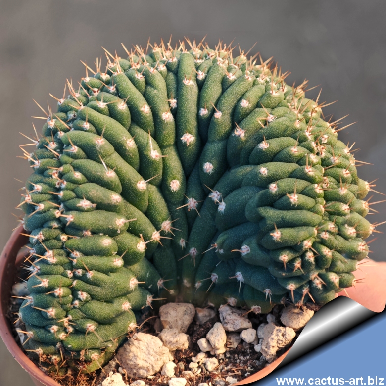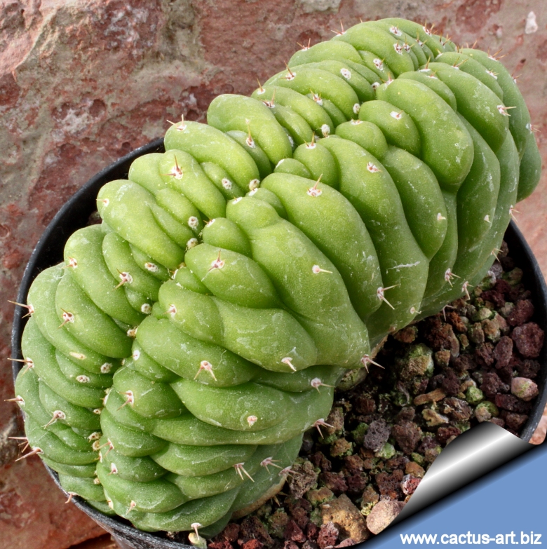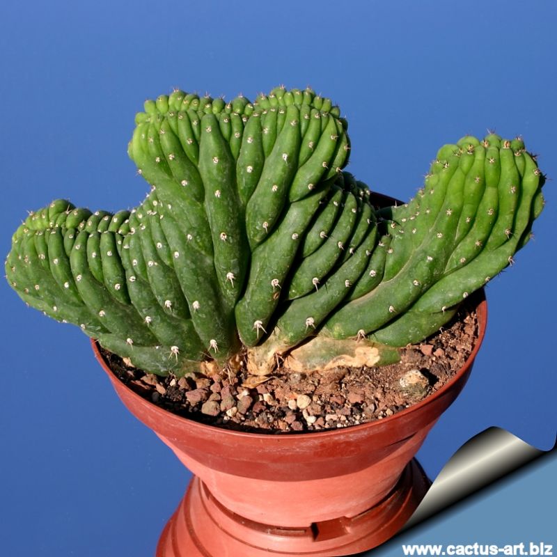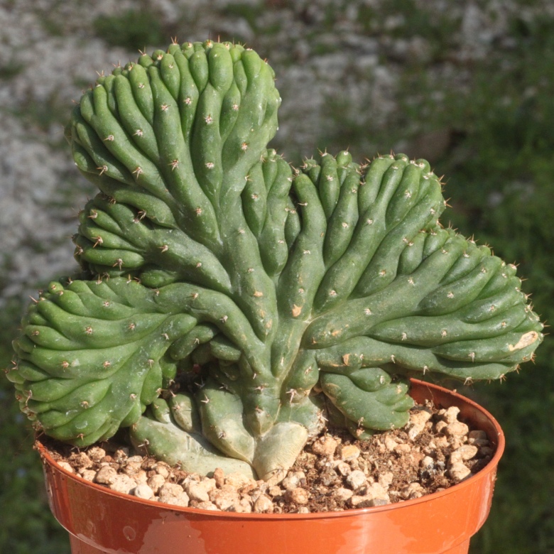 A robust crested cactus that, over time, develops into an imposing mass of sinuous, fan-shaped structures, curved and folded like the convolutions of a large blue-green brain. A stunning visual spectacle.