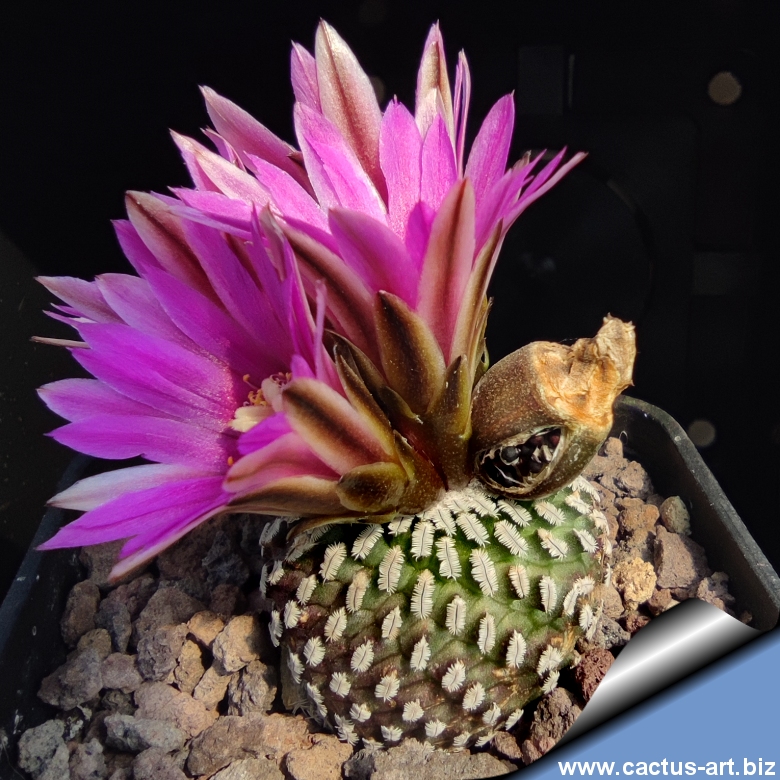 A small geophytic cactus with spiraling rows of tiny tubercles, each crowned by comb-like clusters of fine white spines. It dazzles with bright pink-to-magenta flowers, accentuated by dramatic dark magenta or reddish-brown mid-veins.