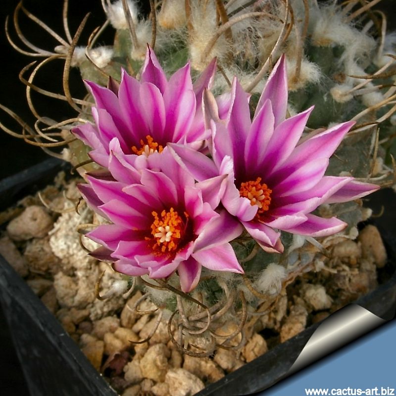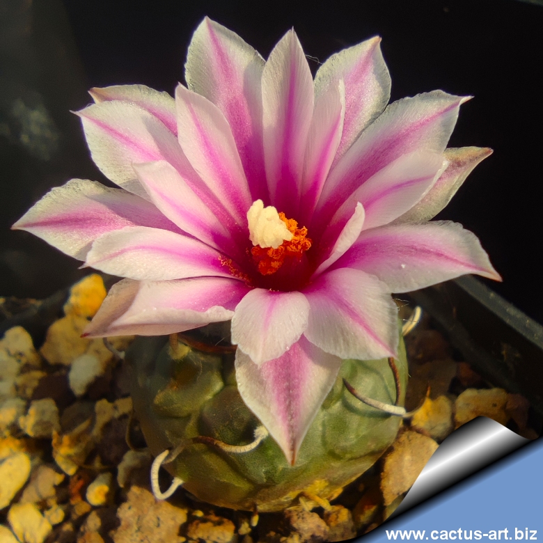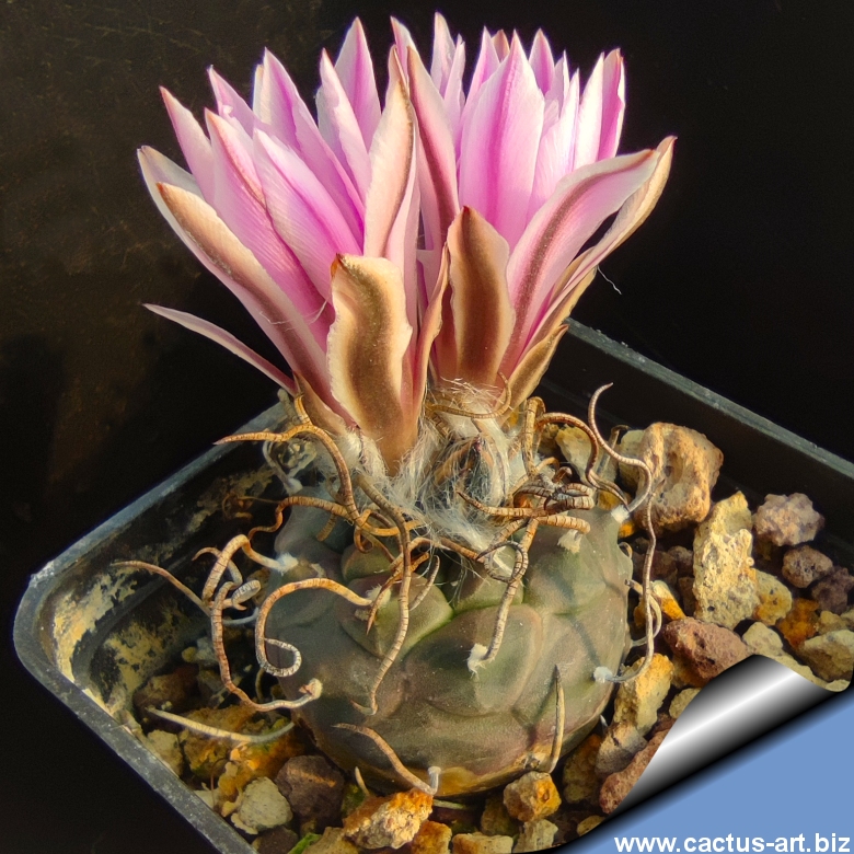 Buds concealed in woolly crowns erupt into flowers more vividly colored than typical schwarzii. Pink petals with magenta midribs create iridescent depth. A chromatic upgrade that makes this variety stand out in any collection. With distinctive corky-textured spines and remarkable visual appeal, this is among the finest Turbinicarpus.